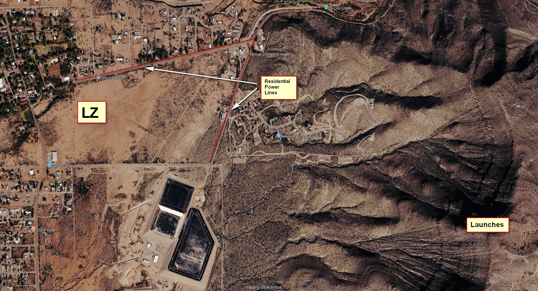 La Luz launch and access roads are either USFS or BLM with no restrictions. The owner of the LZ is listed as Lisa L Quintis of Las Cruces, but it is used by ATV's and motorcycles and we have never been challenged by the landowner.