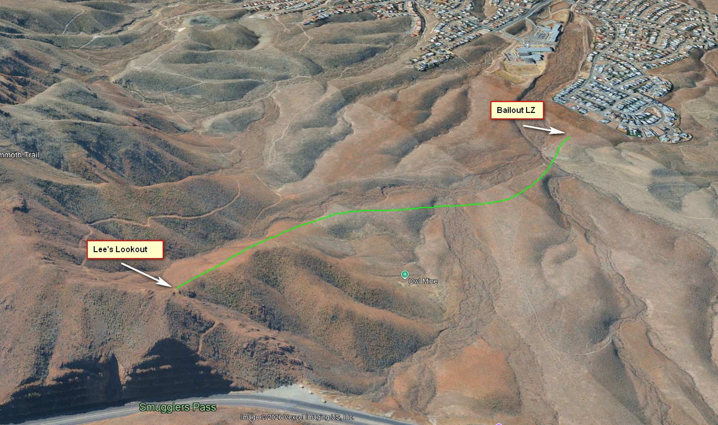If you do a sled ride from launch, just follow the ridge straight out, head for the dirt road that goes from the top of the ridge down the canyon to a housing development. The bail out LZ is at the end of the dirt road 100m before the wall of the housing development.